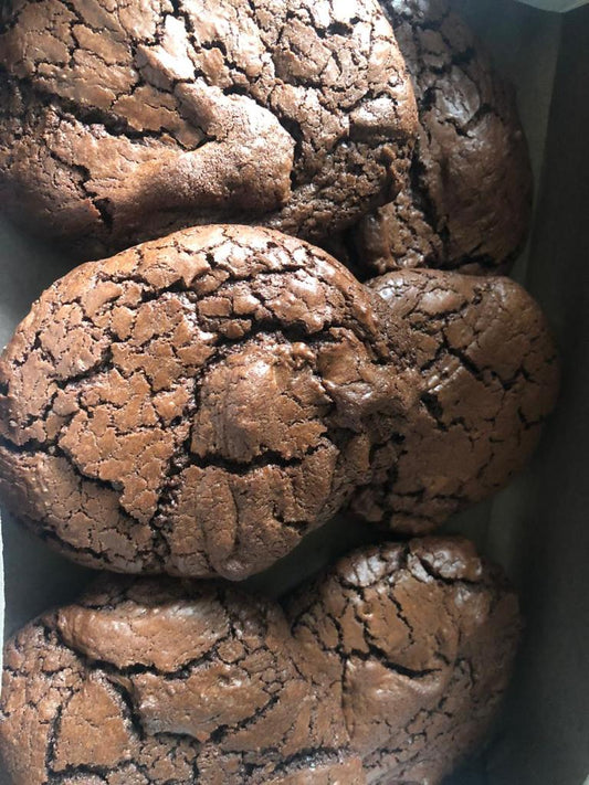 Cross between a brownie and a cookie, can be topped with nuts and white chocolate.