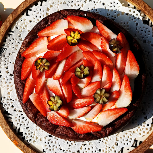 Flourless chocolate cake with a cloud of Vanilla Mascarpone and Fresh Strawberries