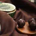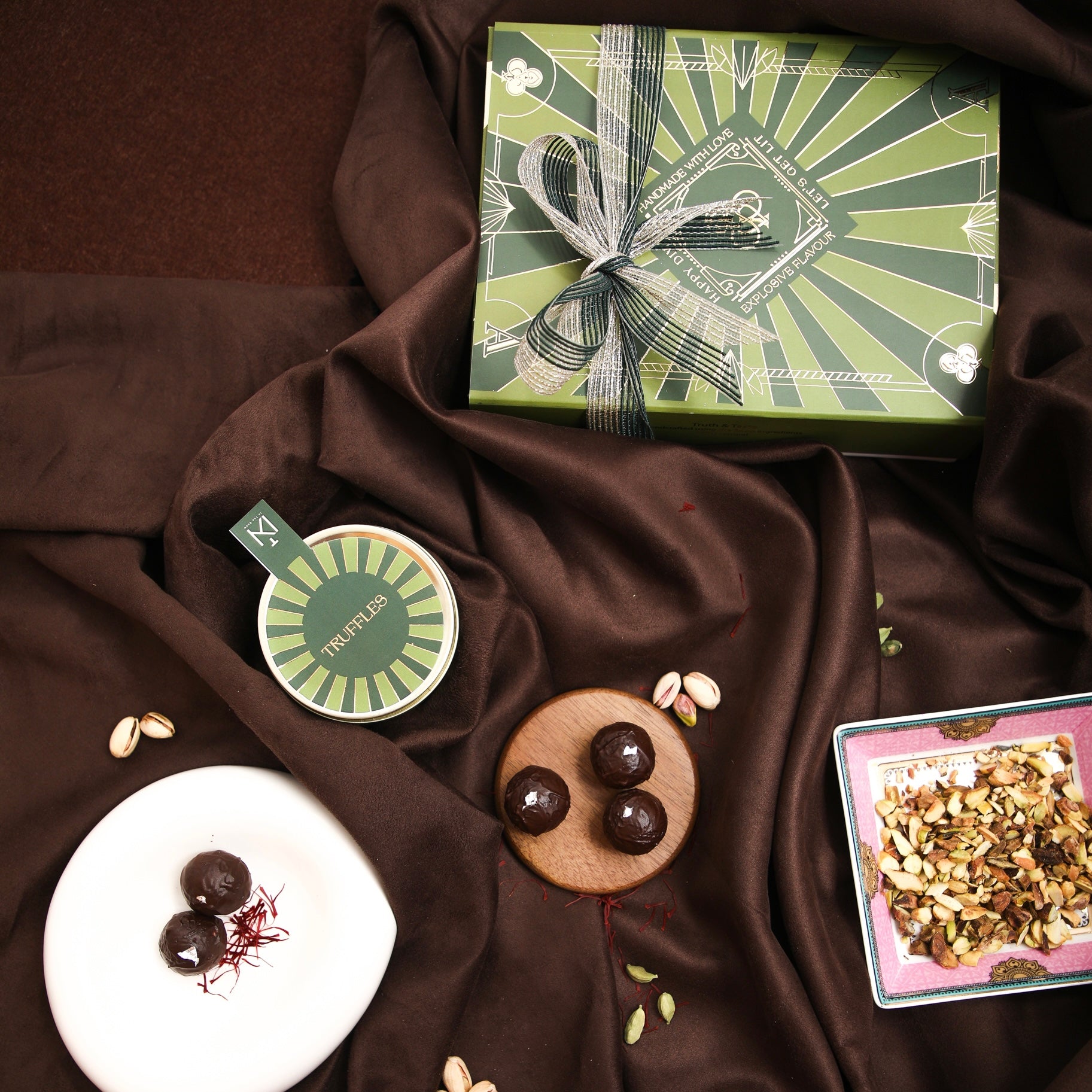 A French chocolate confectionery traditionally made with a chocolate ganache centre, handrolled with saffron and pistachios, topped with a silver leaf garnish