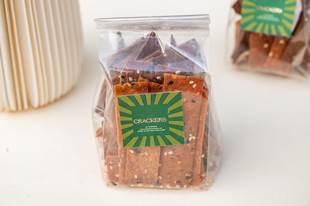 Thin and Crispy crackers made with sourdough discard seasoned with Sesame seeds and Maldon Sea Salt.